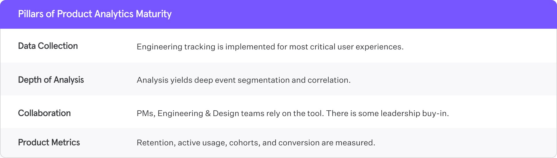 In the Advanced stage of product analytics maturity, data is your compass for most decisions. This analysis is driving your product development because you’re constantly considering what works, for who, and why.